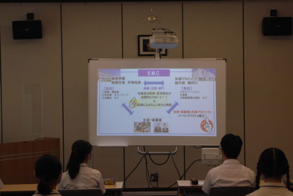 8月9日(火)13時30分から、本校の卒業生である梅村定司先生をお迎えし、「令和4年度 第1回S.M.C.(医学部進学支援プロジェクト)セミナー」を開催しました。梅村先生は、医療法人南労会 紀和ブレスト(乳腺)センター長をされていて、大変お忙しい中、来校いただきました。