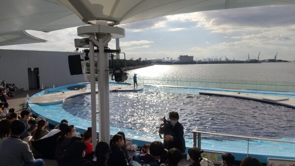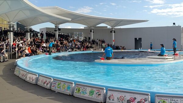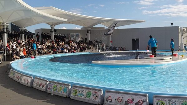 ふたたびバスで移動し、四国水族館へ。ついた時間にちょうどイルカのショーが始まりました。