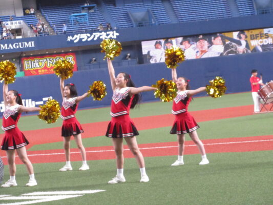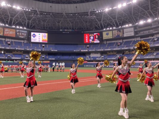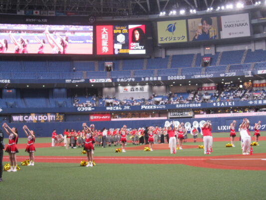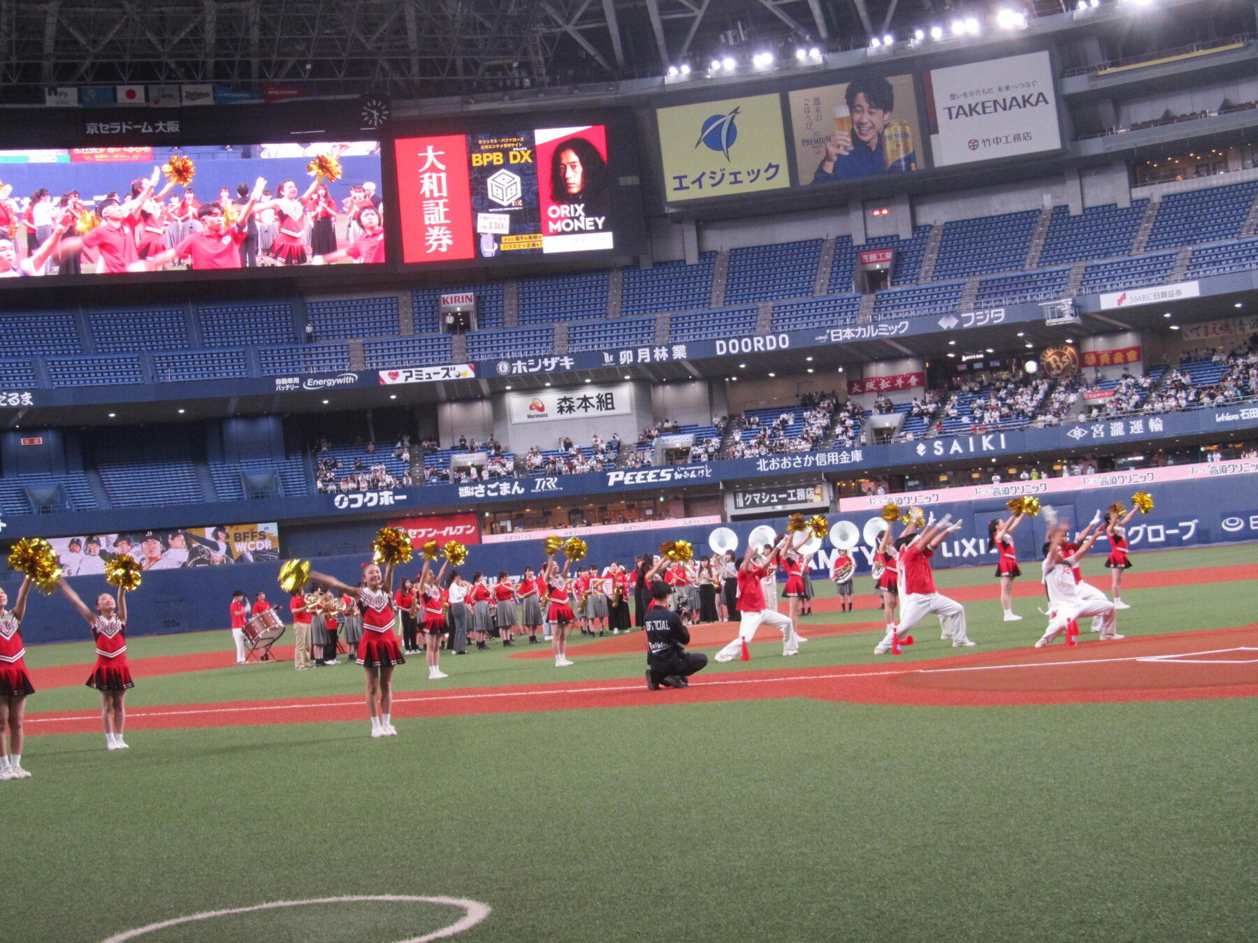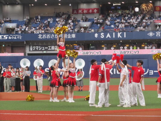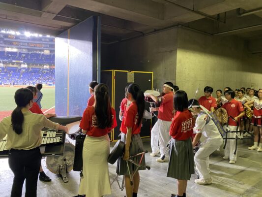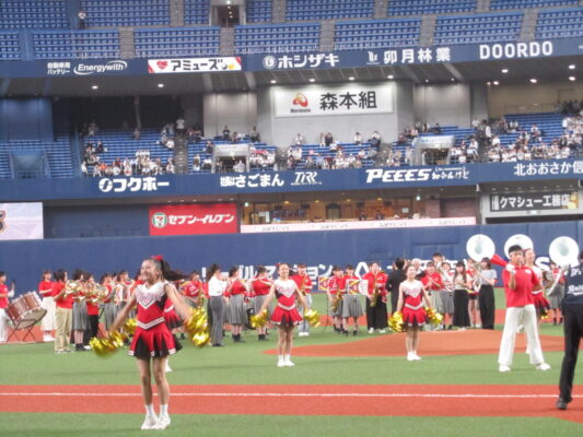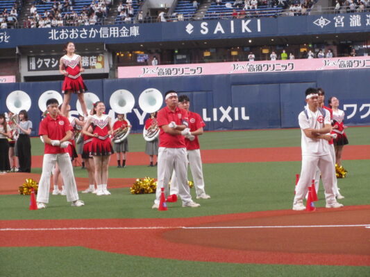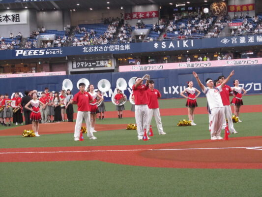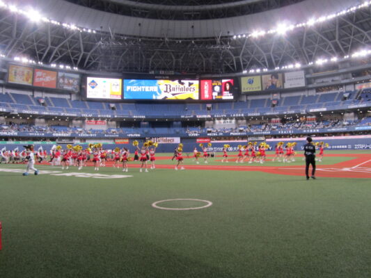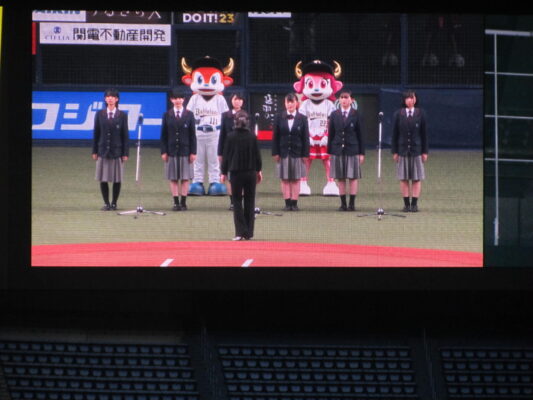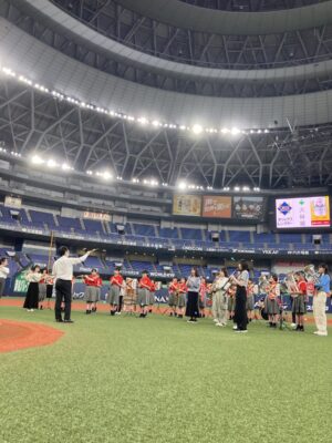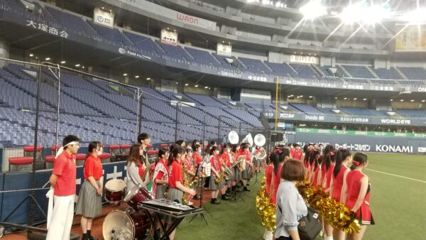 5月19日(金)、京セラドーム大阪で行われたオリックスバファローズ対日本ハムファイターズの試合前セレモニーに出演しました。この日は「バファローズ高校」というイベントのもと様々な企画が行われましたが、そのうちの一つとして、本校の野球応援メドレーを応援団、チアリーディング部、吹奏楽部で披露し、その後コーラス部が国歌斉唱を行いました。