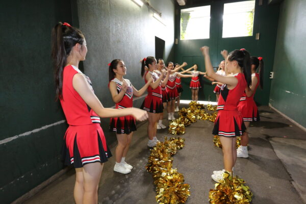 チアリーディング部が甲子園100周年の表現を練習中です。スタンドの反対側の学校が大きな声で叫んで協力してくれました。