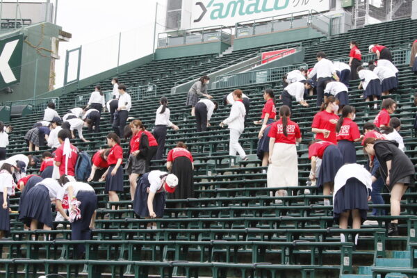 参加校のみんなで協力して、アルプススタンドのイスを拭きました。