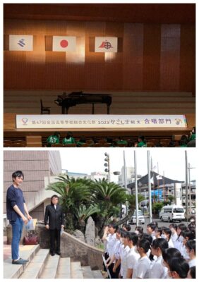 合唱部門は、鹿児島市宝山ホールで45団体が集まり開催されました。私達は奈良県選抜女声合唱団として45名で出演しました。作曲家 三宅悠太先生の委嘱初演曲「この戦いが終わったら」を歌いました。前日、本番ともに三宅先生が来て下さりアプローチ等を直接ご指導頂けたことは大変有意義でした。