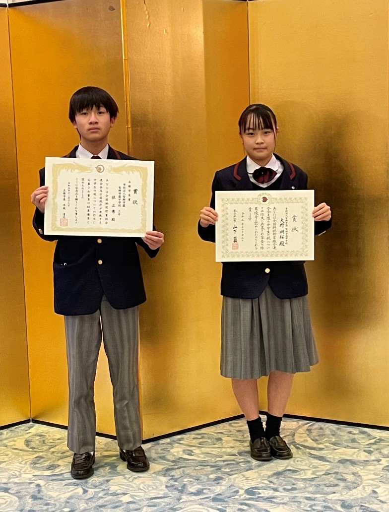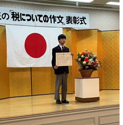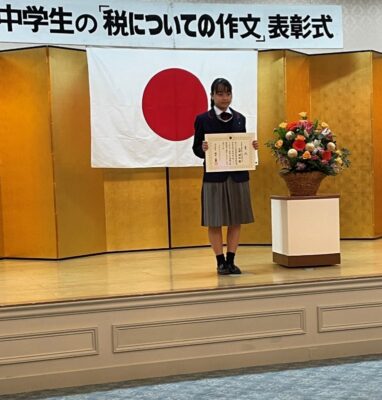 葛城税務署管内2,828作品の応募の中から、中学3年S組大野瑚桜さんの「税金は希望と可能性」が奈良県知事賞を、中学3年A組俵正憲さんの「税が起こした奇跡」が五條市長賞をそれぞれ受賞しました。大野さん、俵さん、おめでとうございます。