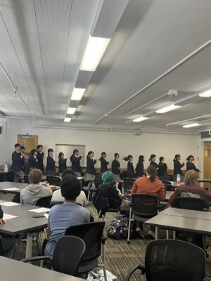 授業最終日に、日本語の授業ではお別れ会を催していただきました。滞在のお礼に皆で「パプリカ」、「U.S.A.」を踊りました。