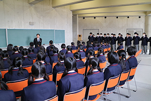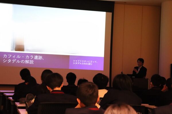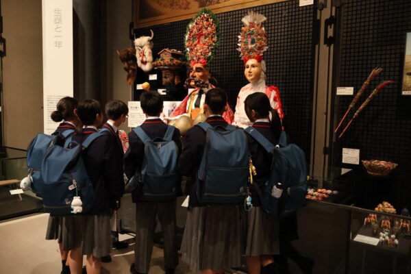その後、学術資源研究開発センター准教授の寺村祐史さんの「シルクロードを通った東西交流と人々の暮らし」についての講義を受けました。生徒たちは興味津々に聞き入り、自分たちが考えていた「シルクロード」との違いについて学ぶことができました。そのあと、常設展に移動して、班で調べ学習をしました。たくさんの展示品に圧倒されていましたが、様々な地域の文化や民俗について学びを深めました。