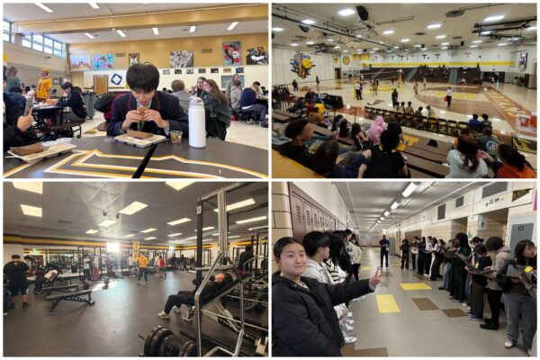生徒の一日は、スクールバスや自分で運転する車で登校します。8時までカフェテリアや廊下でドアが解錠されるのを待ち、IDがないと入れません。8:20~3:20の間に48分(3限は56分)の授業が8つあります。休憩時間は4分で、昼休みは4限目の学年と5限目の学年とに分かれています。カフェテリアの混雑緩和のためと思われます。日本の高校とは違い、授業ごとに生徒が先生の教室に移動するスタイルで、遅刻するとメインオフィスで手続きをしないと教室に入れません。カフェテリアで朝食と昼食が提供され、生徒はIDをかざして利用します。好きなものを取り、どれも美味しそうです。時間割は生徒によって異なり、空きコマを図書館で過ごすこともあります。