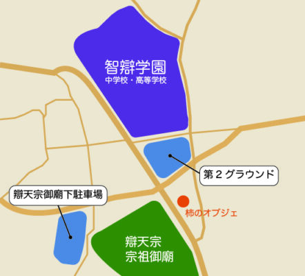 なお、 お車でお越しの場合は、第2グラウンド前または、辯天宗御廟下駐車場をご利用ください。