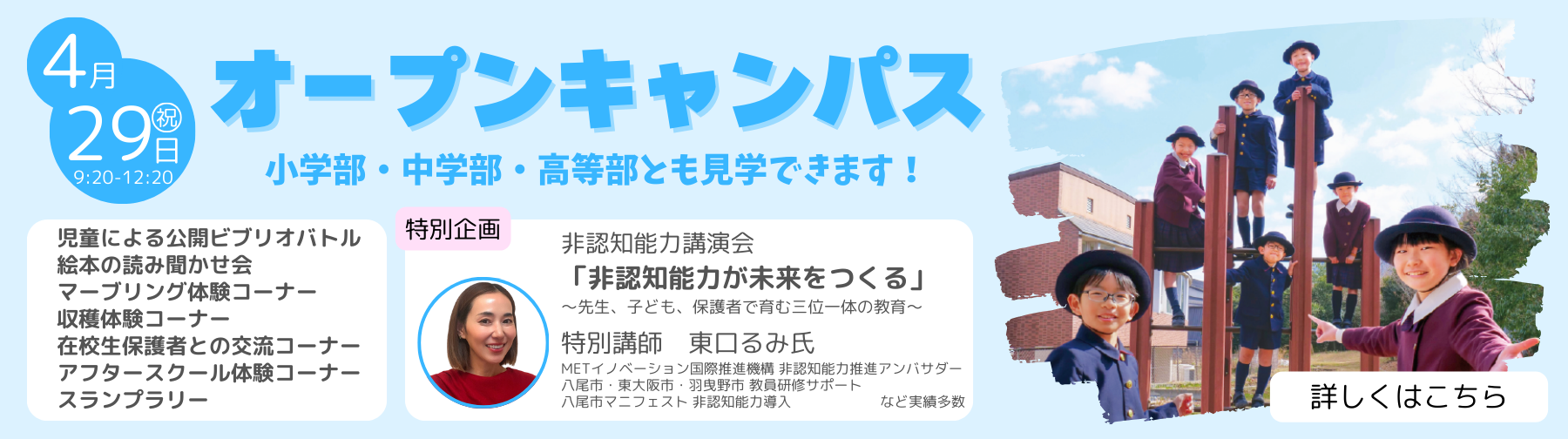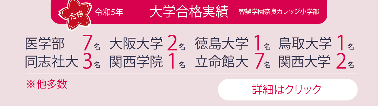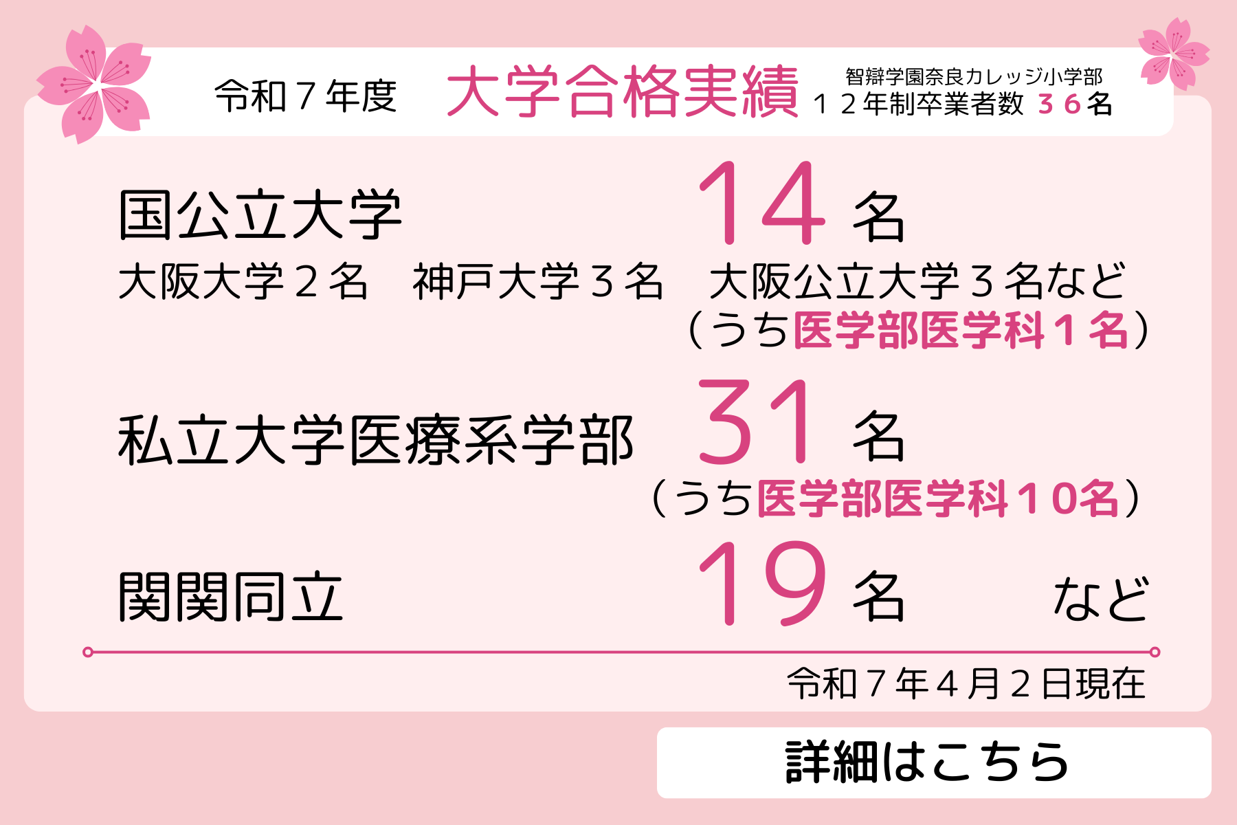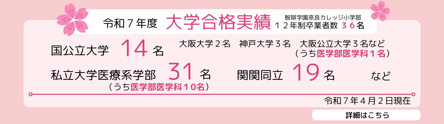学校ブログ 2025/12/12行事911.運動会(1・2年生)2025/12/11行事910.運動会2025/12/10授業909.おすすめの本紹介します(1・3年生)2025/12/9里山908.おにぎりパーティー(4年生)2025/12/8キャリア教育講演会907.キャリア教育講演会(5・6年生)2025/12/3その他906.香芝ふれあいフェスタ・よさこいソーラン演舞2025/12/1授業905.社会(3年生)2025/11/27里山904.さつまいもパーティ(1年生) お知らせ 2025年12月8日 NEW! 12/16(火)・1/15(木)開催のカレッジツアー予約受付中 2025年10月11日 12/6(土)開催 第1回カレッジフェスタ 予約を開始しました! 2025年10月7日 現年長児の保護者の皆様へ -2次入試向け特設ページ- 2025年10月2日 2次入試についてのページを公開しています 2025年7月30日 個別見学のお申し込みをパソコン・スマホからできるようになりました! 学校紹介ビデオ アクセス 学校法人 智辯学園 智辯学園 智辯学園中学校・高等学校 智辯学園和歌山 智辯学園和歌山小学校 智辯学園和歌山中学校・高等学校 智辯学園奈良カレッジ 奈良カレッジ小学部 奈良カレッジ中学部・高等部