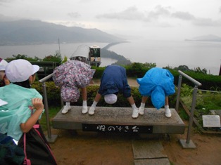 | 1日目 天橋立ビューランドでは、展望台から遠くの景色を見ました。曇り空だったのが、残念でした。 各組に分かれてスタンツの練習をしました。 |