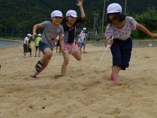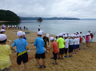 | 2日目 漁師さんの話を聞いて、海辺で地引き網をしました。タイやアジ、イカなどたくさんの魚が捕れました。 また、ビーチフラッグなどの砂浜のアクティビティーをしたり、キャンプファーイヤーで趣向を凝らした出し物をしたりしました。 |