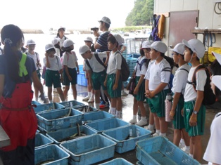 | 3日目 魚を選別する様子を見学しに行きました。たくさんの魚がかごに入れられ、中には珍しい魚もいました。 |