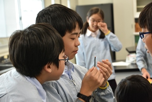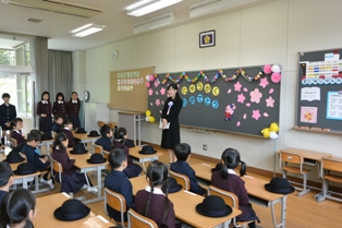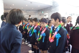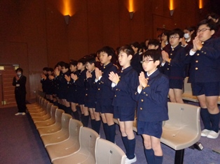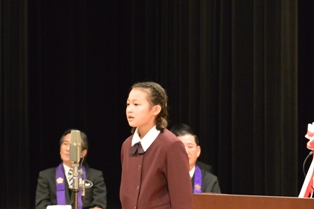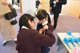 その他 26.入学式 2015年4月12日 2015年4月12日 12期生の入学式が行われました。新入児は保護者の方と一緒に登校し、受付で6年生のお兄さん・お姉さんから名前のリボンをつけてもらいました。また、2年生からは折り鶴の首飾りをプレゼントしてもらいました。入学式では、理事長先生からお念珠をいただき、元気の良い「頑張ります」の声が講堂内に響きました。