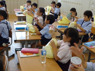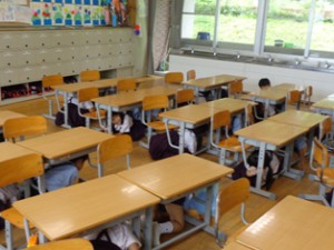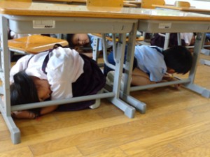 その他 43.ナラ・シェイクアウト 2015年7月9日 2015年7月9日 奈良県が実施した「ナラ・シェイクアウト(奈良県いっせい地震行動訓練)」に本校でも取り組みました。訓練が始まると、担任の先生の指示に従って、机の下に身を隠しました。また、万一の際に配付する備蓄品の内容をみんなで確認しました。