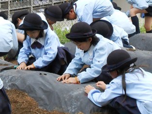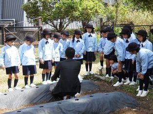 3年生が校内にある畑に、キャベツの苗を植えました。大きくなるのが楽しみです。