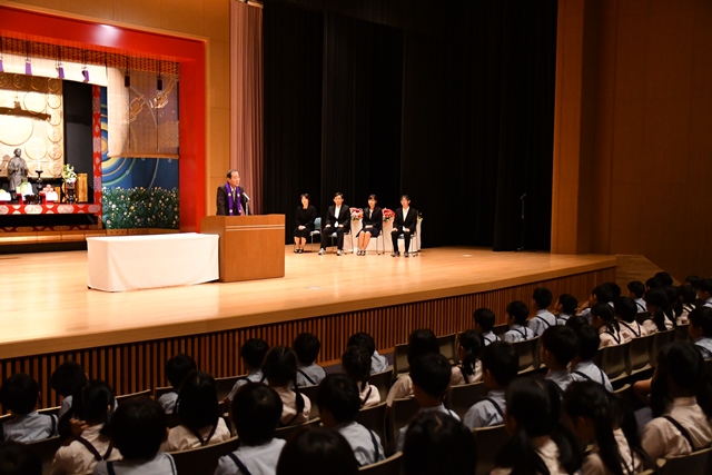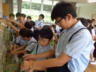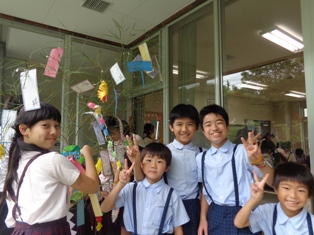 1・2年生が6年生に教えてもらいながら、折り紙で七夕飾りを作り、願いのこもった短冊と一緒に吊しました。