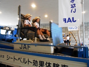 前半は、時速6kmで走る自動車が衝突したときのシートベルトの効果を体験をしたり、自動車の運転席からの死角を調べたり、反射材が暗い場所においてどれだけ効果的であるかを確認しました。