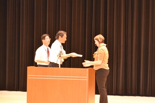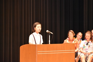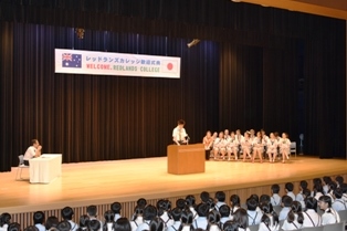 歓迎式典では、本校校長とレッドランズカレッジの引率の先生による挨拶・記念品交換が行われました。レッドランズカレッジの留学生は一人ひとり日本語で自己紹介をし、本校の児童会代表は英語で歓迎の挨拶をしました。