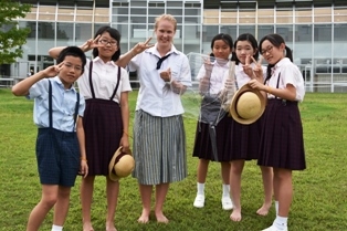 6年生との交流会では、カルタ取りと凧揚げをしました。カルタは、日本の文化をテーマにしたものを自分たちでつくって準備しました。カルタ取りの途中、レッドランズカレッジの留学生が素早くカルタを取ると、歓声が上がりました。凧揚げでは、芝生の敷かれた憩いの広場で、両校の生徒児童とも裸足になって気持ち良さそうに走っていました。