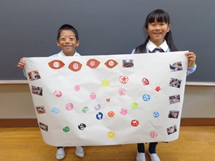 その他 140.芋版づくり(1年生) 2016年11月9日 11月10日の保護者会で、サツマイモを使って芋版を作りました。彫刻刀で彫るという初めての作業に苦心しながらも、保護者の方と一緒に楽しみながら作っていました。好きな色の絵の具を塗って押す時には、どのようにうつっているか、わくわくした顔で見ていました。個性的で素敵な芋版がたくさんできました。...