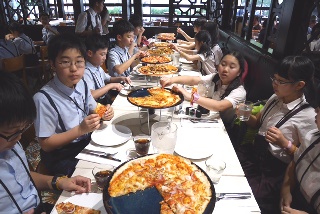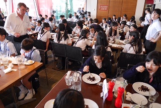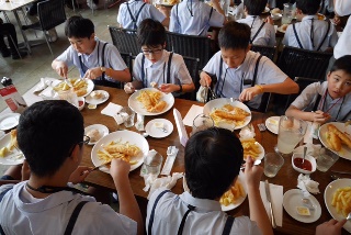 昼食はフィッシュアンドチップスでした。デザートはチョコレートラズベリーケーキで、児童はお腹いっぱいと言いながらも、おいしそうに食べていました。