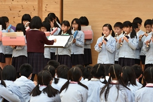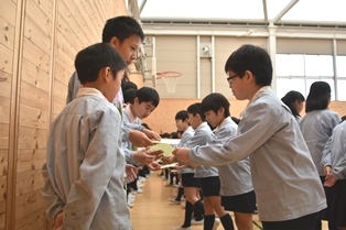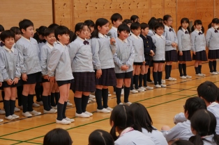 その他 171.6年生を送る会 2017年3月17日 2017年3月17日 3月17日の児童会集会で、6年生を送る会を行いました。 1~5年生の児童が学年ごとに、6年生に贈り物を作って渡したり、感謝を伝える歌や演奏の発表をしたりしました。6年生は贈り物に書かれたメッセージを嬉しそうに読んだり、歌や演奏を発表している様子を優しい目で見たりしていました。 最後に教頭先生から激励の言葉があり、6年生は中学生になることを、5年生は最高学年になることを自覚した様子でした。