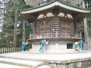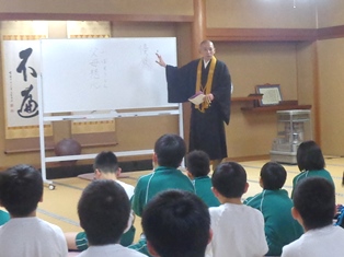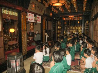 住職様の法話では、「父母想心」という言葉を教えていただき、「父母の恩」について学びました。下座行として伽藍の金堂を掃除したり、奥の院を参拝したりと、児童達はどの修行にも熱心に取り組んでいました。
