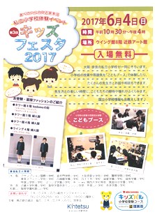 その他 〈児童募集〉第3回キッズフェスタのお知らせ〈終了〉 2017年6月1日 2017年6月1日 本イベントは終了しました。多数のご来場本当にありがとうございました。 第3回キッズフェスタ2017に智辯学園奈良カレッジ小学部が参加しますので、ぜひご来場下さい。 〈キッズフェスタちらし表〉 〈キッズフェスタちらし裏〉 第3回キッズフェスタHPはこちら