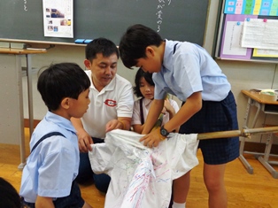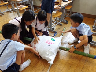 新聞紙や古着など身近なものを使って、かかしの体をつくりました。児童みんなで協力してつくったかかしは、一人では持ち上げることのできない程の大きさになりました。