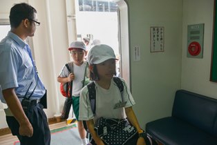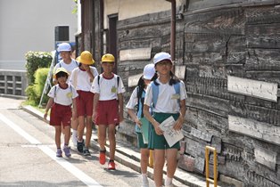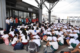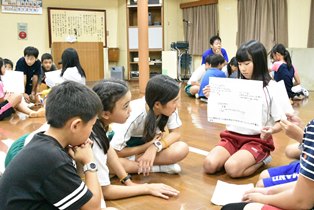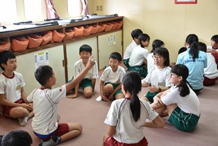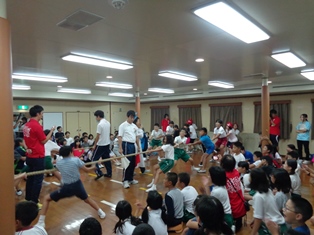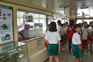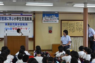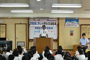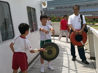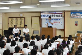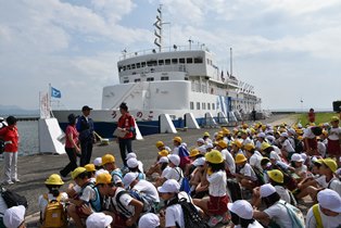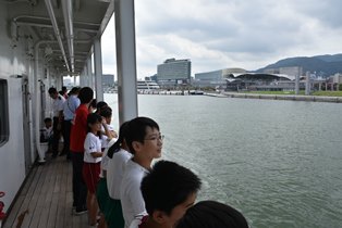 児童らは大津港で水口小学校の5年生と合流し「うみのこ」に乗船、4時間ほどで長浜港に到着し、タウンウォークラリーをしました。夜は班ごとに学校紹介をした後、つなひき大会をし、大盛り上がりで1日目が終わりました。