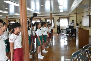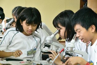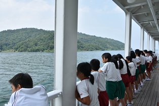 2日目は朝から琵琶湖の環境学習をしました。プランクトンや水草、湖底の砂を観察して琵琶湖の状態を調べたり、カッターで琵琶湖に出て琵琶湖の水を直に見たりするなどの活動を行いました。本校の児童らは、仲良くなった水口小学校の5年生と一緒に、力を合わせたり意見を出し合ったりしながら、学習を進めていました。