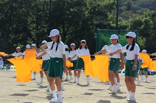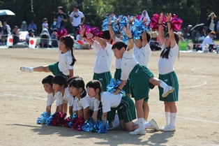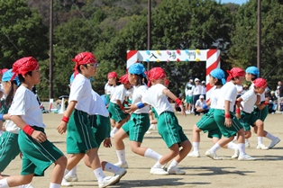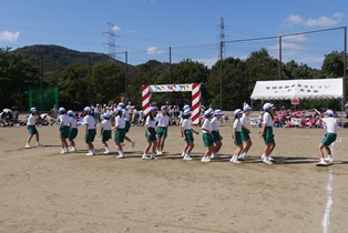 少し暑く感じる程の晴天の中、児童たちは色別の分団に分かれ、一生懸命に競い合いました。