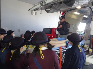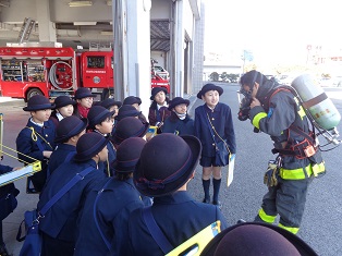 消防車両や消防署内の見学をしました。消防隊員の方々は丁寧に、仕事の心構えや、署で行っている活動を教えてくださいました。また、最後には訓練の様子も見せていただきました。