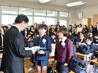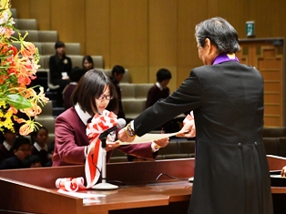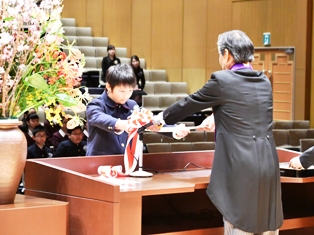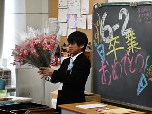 卒業生は、来賓の方はじめ、保護者、在校生、教職員全員の温かな拍手に迎えられて入場しました。卒業証書授与では、自分の名前が呼ばれると、「はい!」と元気に返事し、校長先生から卒業証書を手渡されると「ありがとうございました。」と大きな声でお礼を言いました。