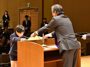 終業式に先立ち、「第61回全国学芸サイエンスコンクール」「第63回青少年読書感想文奈良県コンクール」のそれぞれで、優秀な成績を収めた児童に表彰伝達を行いました。