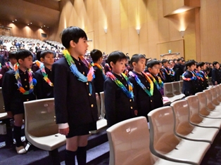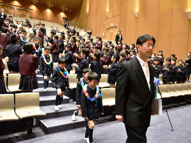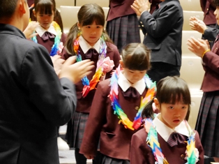 来賓の方をはじめ、保護者、在校生、教職員全員の温かな拍手に迎えられて新入児が入場しました。念珠授与では、少し緊張した面持ちで講堂の舞台上にのぼり、自分の名前が呼ばれると、大きな声で返事をし、理事長先生から念珠を手渡されると「頑張ります!」と立派に宣言することができました。