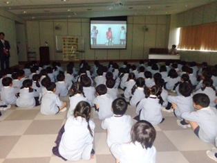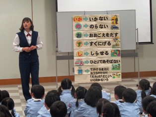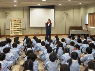 中南和少年サポートセンターの木田様と香芝警察署の浜口様にお越しいただき、不審者からの声かけへの対処法と、連れ去りなどの危険な場面に直面したときの対処法、危険な場面に遭遇しないための注意点、非行防止についてお話しいただきました。児童たちは、真剣な表情で話に耳を傾け、児童たちにとって常日頃の防犯意識を高める良い機会となりました。