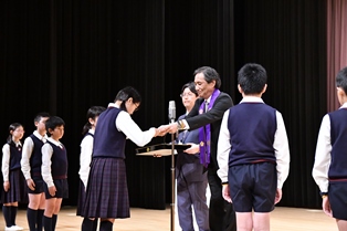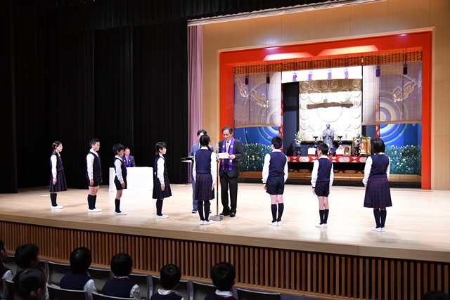 児童会役員任命式では、先日行われた児童会役員選挙によって選出された5・6年生8名が児童会役員に任命されました。任命状授与の後、児童会会長が挨拶と所信表明を行いました。