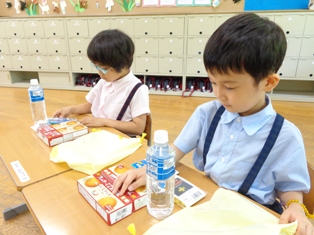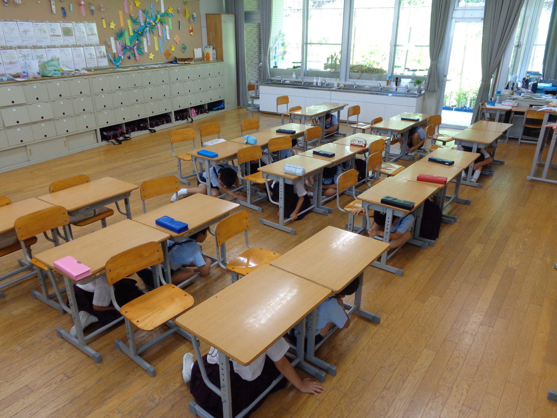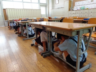 その他 273.ナラ・シェイクアウト 2018年7月10日 2018年7月20日 昨年に引き続き今年も「ナラ・シェイクアウト(奈良県いっせい地震行動訓練)」に参加しました。 7月10日(火)10時30分から校内放送を合図に一斉に児童が机の下に身を隠すという訓練を行いました。また、教室にある備蓄品を児童に配付し、内容物の確認も行いました。 訓練の様子① 訓練の様子② 訓練の様子③ 備蓄品の確認