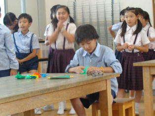 7月18日(水)から27日(金)にかけて、折り鶴早折り大会が開催されました。伝統的な折り鶴を15分間で何羽折れるか、3人一組の団体戦と個人戦、それぞれ低学年(1~3年生)・高学年(4~6年生)に分かれて競いました。本番当日、団体戦では、声をかけ合ったり分担したりと、各組毎に工夫して取り組んでいました。個人戦では、打って変わって黙々と折り続ける緊張した戦いとなりました。団体戦では、低学年が最高6羽、高学年が最高13羽、個人戦では、低学年が最高5羽、高学年が最高8羽という結果になり、それぞれ達成感を胸に、表彰状を受け取りました。