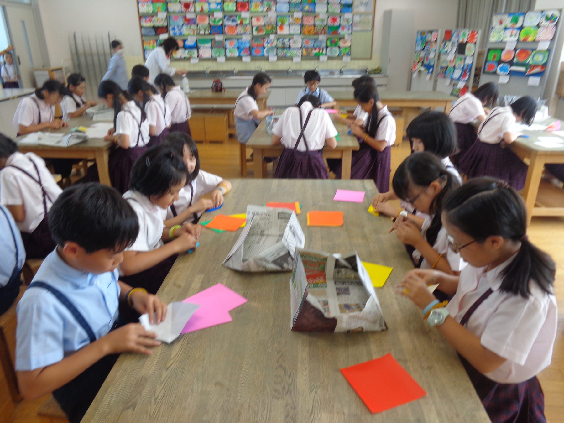 7月18日(水)から27日(金)にかけて、折り鶴早折り大会が開催されました。伝統的な折り鶴を15分間で何羽折れるか、3人一組の団体戦と個人戦、それぞれ低学年(1~3年生)・高学年(4~6年生)に分かれて競いました。本番当日、団体戦では、声をかけ合ったり分担したりと、各組毎に工夫して取り組んでいました。個人戦では、打って変わって黙々と折り続ける緊張した戦いとなりました。団体戦では、低学年が最高6羽、高学年が最高13羽、個人戦では、低学年が最高5羽、高学年が最高8羽という結果になり、それぞれ達成感を胸に、表彰状を受け取りました。