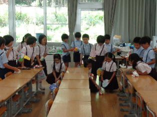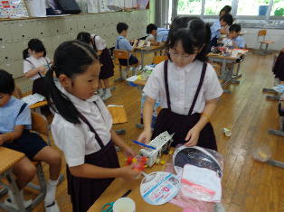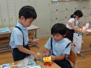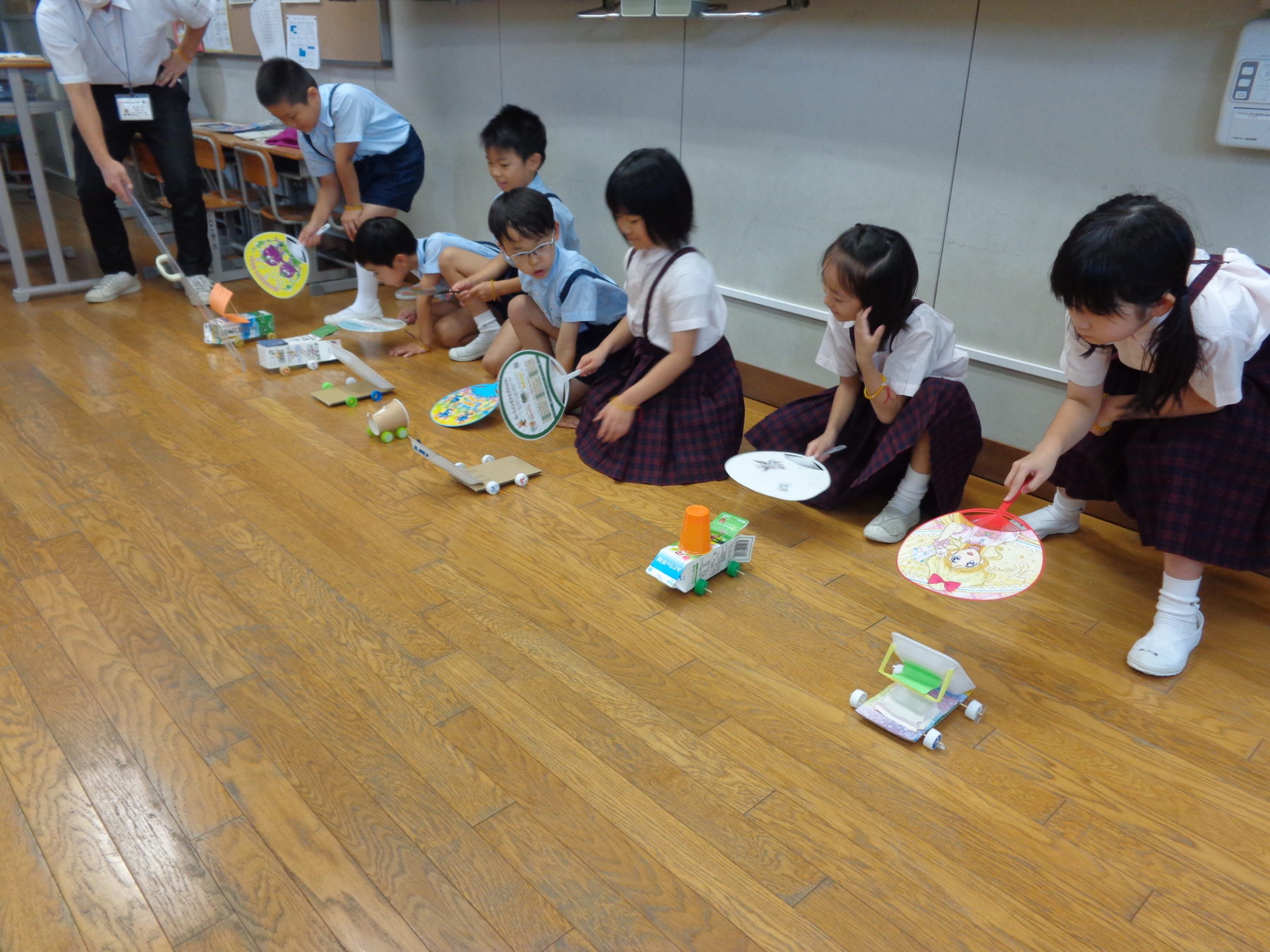 8月28日(火)、2年生の生活の授業では、「うごくうごく わたしの おもちゃ」の学習で、みんなでヨットカー作りをしました。子どもたちは、牛乳パックやトレー等を使って試行錯誤しながら一生懸命作っていました。また、「タイヤが動かない。」「うまくくっつかない。」などと友だちに相談し、助け合っている姿も見られました。各クラスでヨットカーのレース大会もして大いに盛り上がっていました。