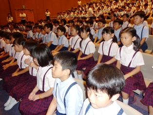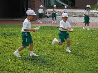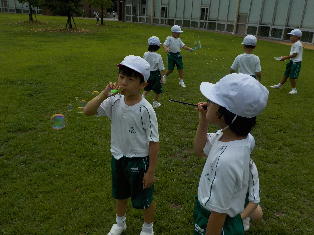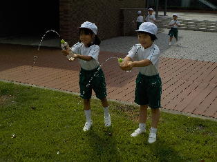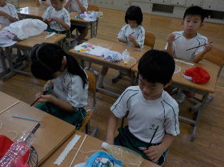授業 282.生活の授業「夏遊び」(1年生) 2018年8月28日 2018年9月13日 8月28日(火)、1年生の生活の授業で、「夏遊び」をしました。ペットボトルとストローを使って水鉄砲を作ったり、針金に毛糸を巻いてシャボン玉を作る道具を作製したりました。既製品ではなく、自分たちで作った道具で遊べたことが楽しかったようです。時間を忘れてしまうほど夢中になりました。 言われたとおりに作れるかな。 上手にシャボン玉ができました。 それ!水鉄砲で勝負だ! 「せーの!」