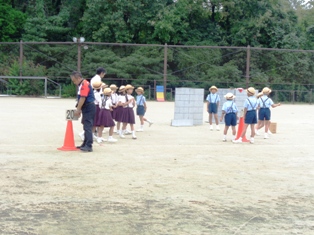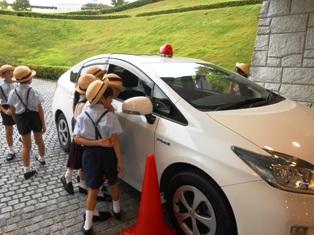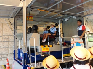 運転席からの死角体験では、車の周りに10本置いてあるコーンのうち、どのコーンが運転席から見えるという問いかけにも、児童たちは真剣に考えていました。1本も運転席から見えるコーンがないということを職員の方から教わり、児童たちはとても驚いていました。