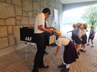 まずシートベルト体験では、時速7キロメートルで走行中の自動車が急ブレーキを掛けたとき、どれくらいの衝撃を受けるかを児童に体験してもらいました。たいしたことはないだろうと高を括っていた児童たちも実際には結構な衝撃を受けることに驚き、シートベルトを着用することの必要性を身にしみて学んだようです。
