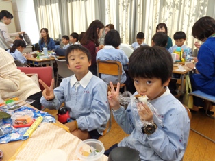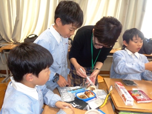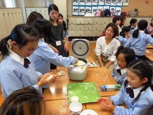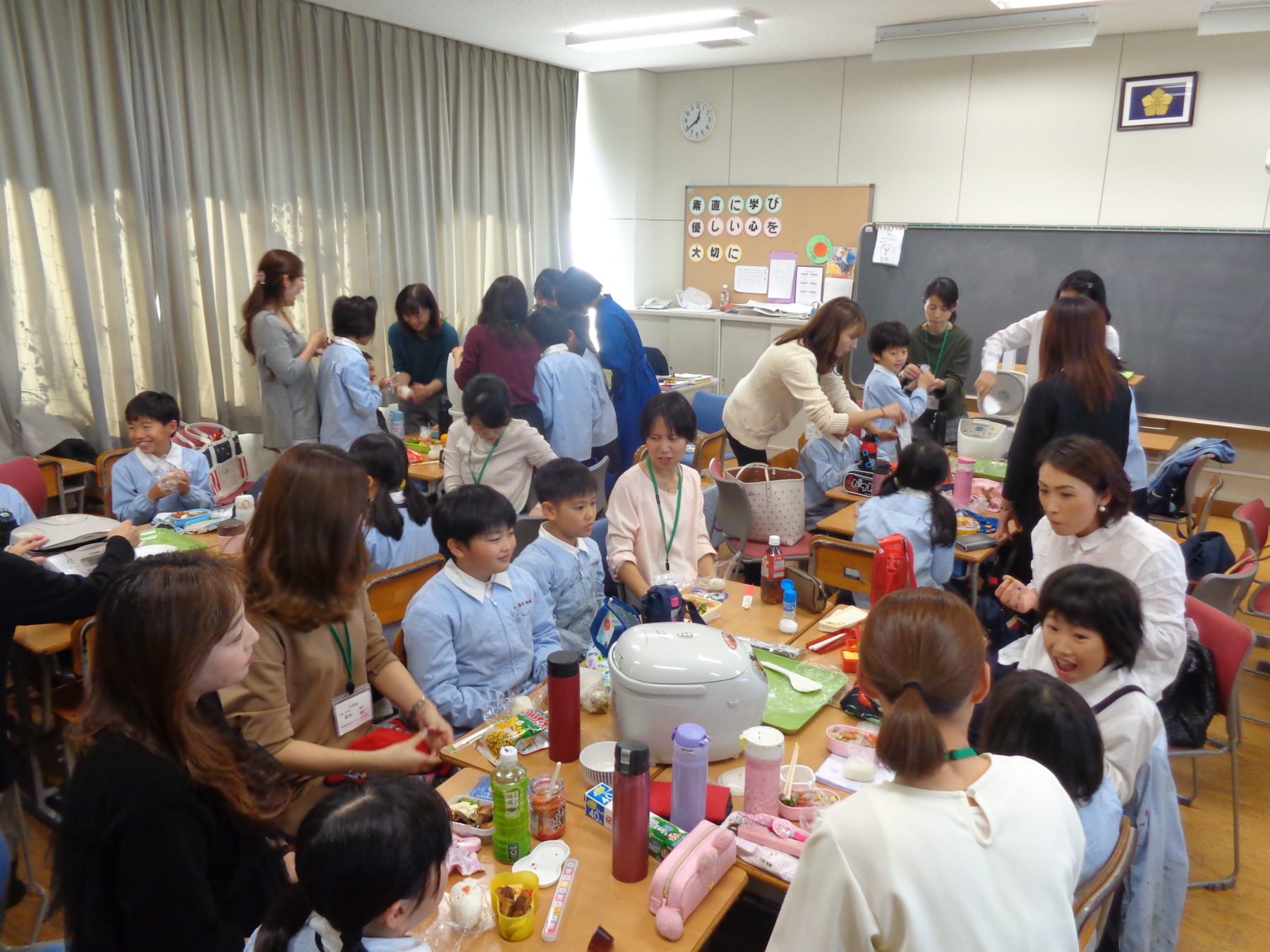 11月7日(水)のお昼に、4年生が自分たちで育てたお米で、親子が協力しておにぎり作りをしました。