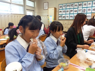 児童たちは自分たちの手で育てたお米はやっぱりおいしいと嬉しそうでした。教室は笑顔であふれていました。