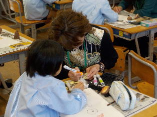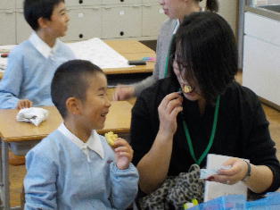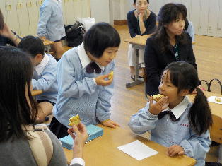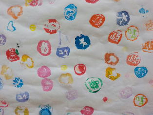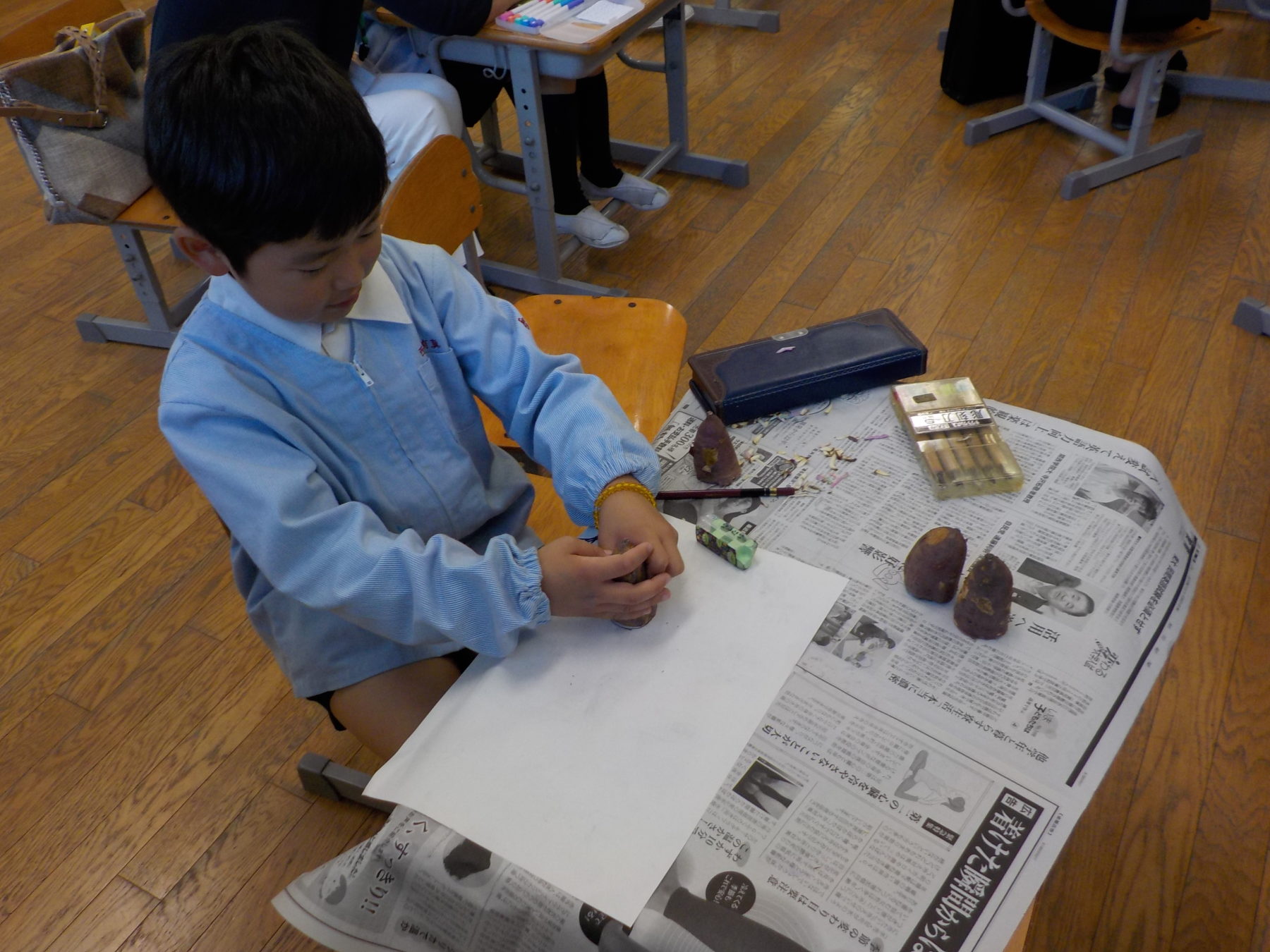 校内の畑で採れたサツマイモを使って、保護者とともに協力しながら作業をしました。「ここを彫ったらいいの?」「削ったらどうなるの?」と保護者から手ほどきを受けながら作った芋判を手に取り、うれしそうに台紙に判を押していました。その後、焼き芋を食べ、サツマイモづくしの一日となりました。