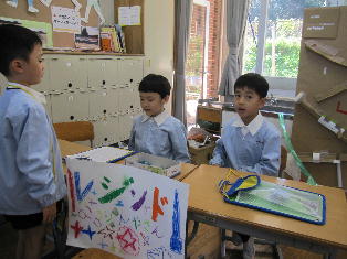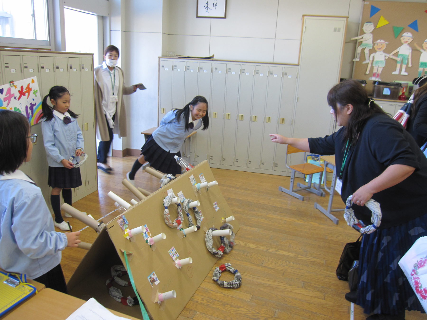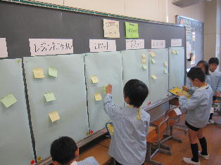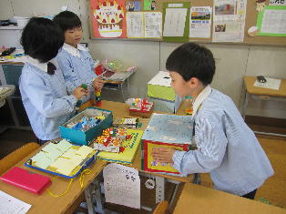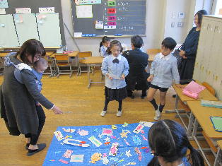 各教室では「おもちゃ祭り」と題して、空気砲的当てや輪投げなど、様々なおもちゃのお店がオープンし、大いににぎわいました。児童たちは売り子とお客に分かれ、保護者の方もお客となっておもちゃ体験をしました。黒板には、それぞれのお店の掲示板が設置され、お客の書いた、お店のよかったところやお店へのアドバイスが貼り出されました。それをお店側がすぐにチェックし、おもちゃの具合やお客への対応に生かすことができるシステムをつくりました。そのおかげで、おもちゃの不具合などはすぐに改善され、「売り子の声が大きくて良かった」「おもちゃがよく工夫されていた」などの評価につながり、児童たちも誇らしい表情を浮かべていました。自分たちが楽しいだけではなく、人に楽しんでもらうことの喜びや、工夫することのおもしろさが学べた、有意義な授業参観になりました。
