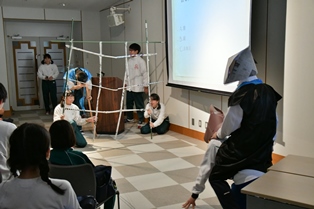 大講義室では、中学部で学習する織田信長の一生についてプレゼンテーションをしてくれました。小学生にとってはまだ学習しておらず難しそうな内容でしたが、劇を交えて易しく解説してもらい、児童たちはよく理解することができました。