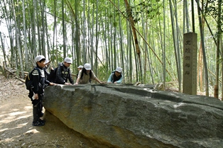 飛鳥資料館で様々な史料を観覧し、飛鳥寺で飛鳥大仏(銅造釈迦如来坐像)を拝観しました。その後、班ごとに飛鳥宮跡や酒舟石などの遺跡を巡りながら、石舞台古墳まで約1時間のウォーキングをしました。